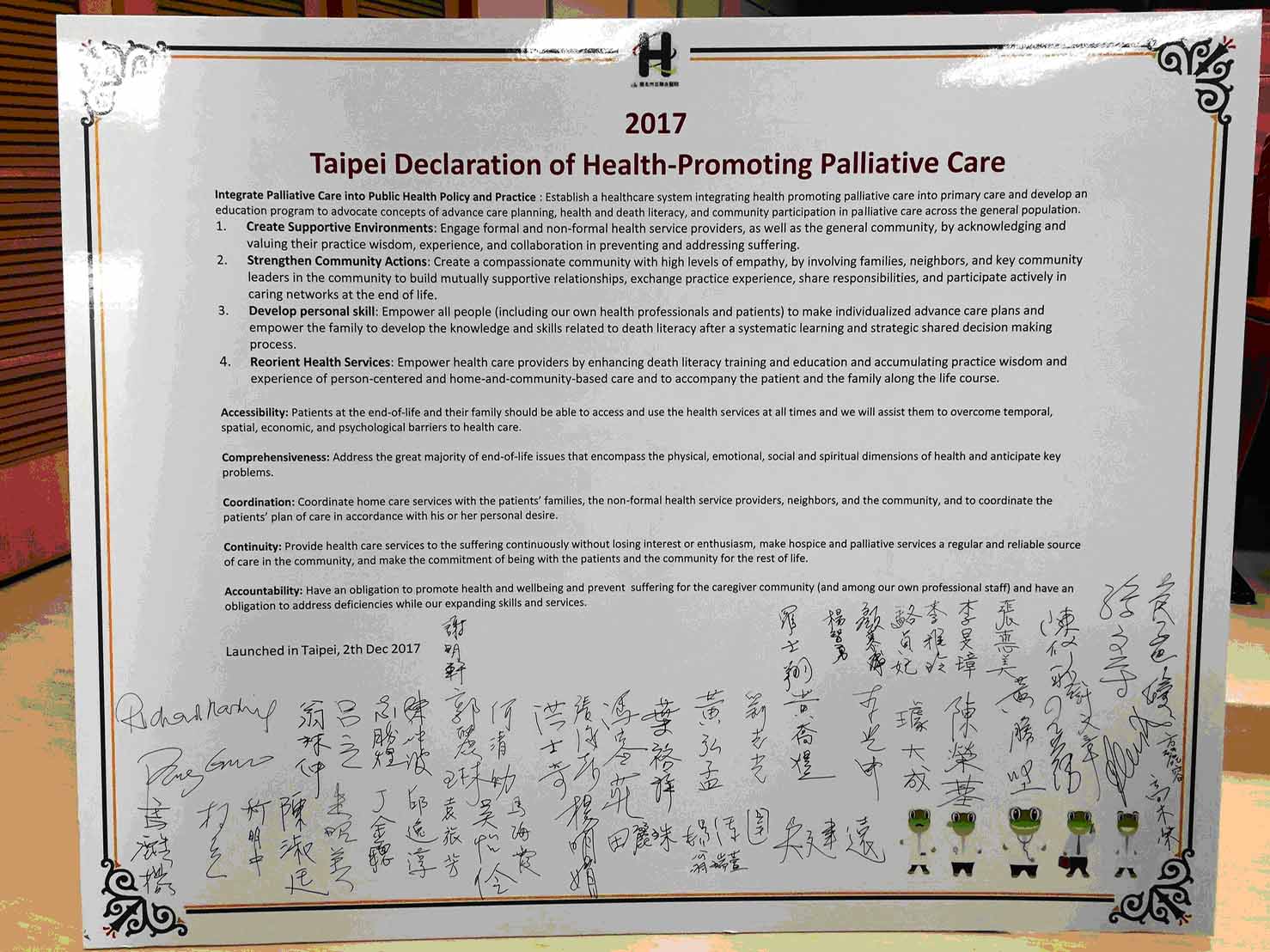 市聯醫以這些成效舉辦2017台北國際安寧研討會,並發布台北宣言(2017Taipei Decleration for Health-Promoting & Literacy-Enhancing Palliative Care: Palliative Care as a Form of Health Promotion in Community.)。強調社區安寧緩和照護對健康促進的重要性。獲得國內外學者的共同簽署支持。(圖1)