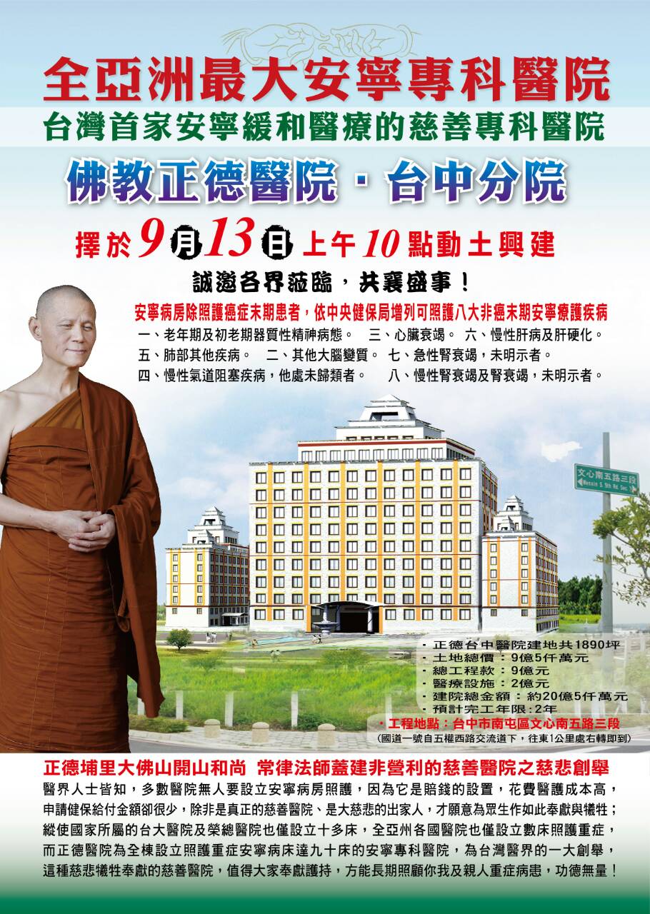 創辦正德癌症醫療基金會、正德社會福利慈善基金會、正德佛堂等團體的開山祖師常律法師,多年慈悲關心癌症病人的心願,終於將由台中正德醫院的建立而開始實踐。基金會已安排將於9月13日動土興建,預定兩年完工。