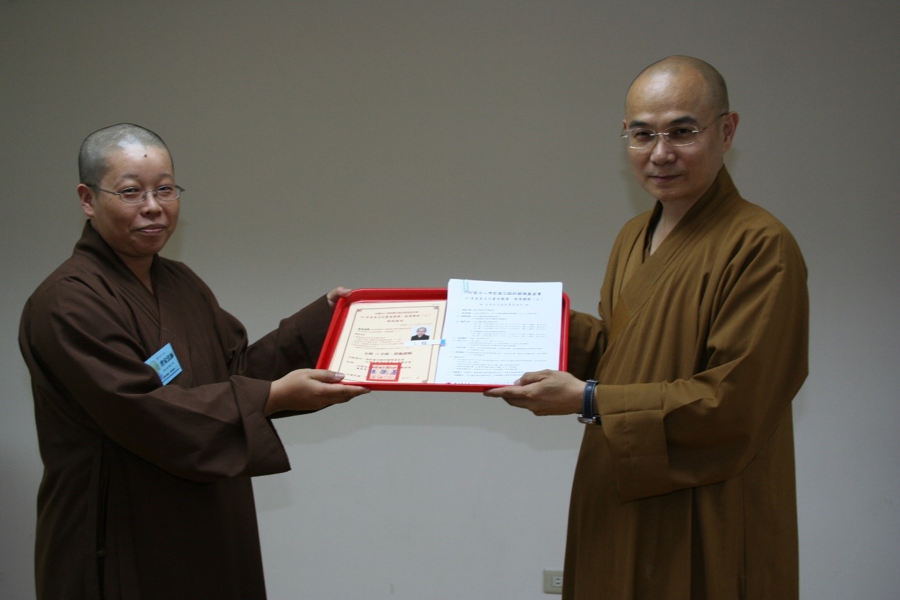 (圖2) 結業的法師接受惠敏校長(右)頒授結業證書。