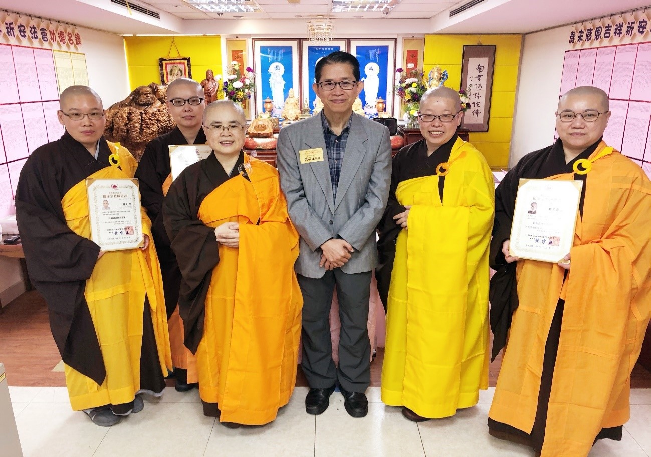(圖3) 2019年參與完整培訓的法師經甄審通過,由黃宗正董事長授予「臨床佛教宗教師」認證。