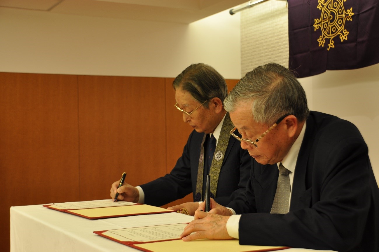 (圖5) 2015年陳榮基董事長受邀前往日本參加「日本公益財团法人全国青少年教化協議会臨床仏教研究所」臨床佛教宗教師第一屆畢業典禮,並與齋藤昭俊事務總長簽訂合作協議書。